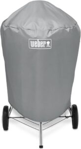 The Weber standard cover protects your 22-1/2-inch grill with full length vinyl. The premium heavy duty polyester fabric is water & UV resistant along with breathable to help protect the grill from the elements. Fastening straps provide a more fitted appearance & keep it in place during windy conditions.